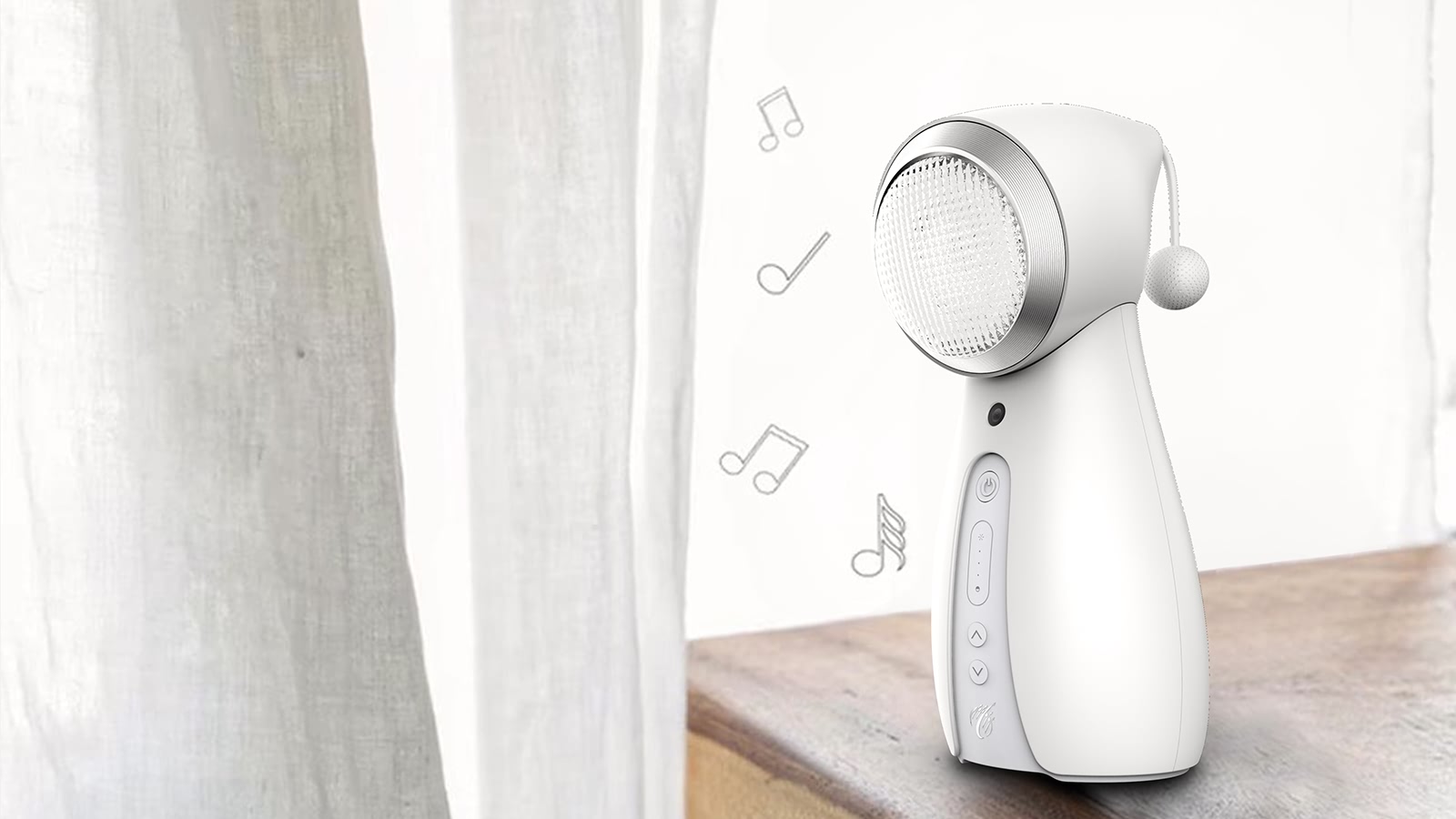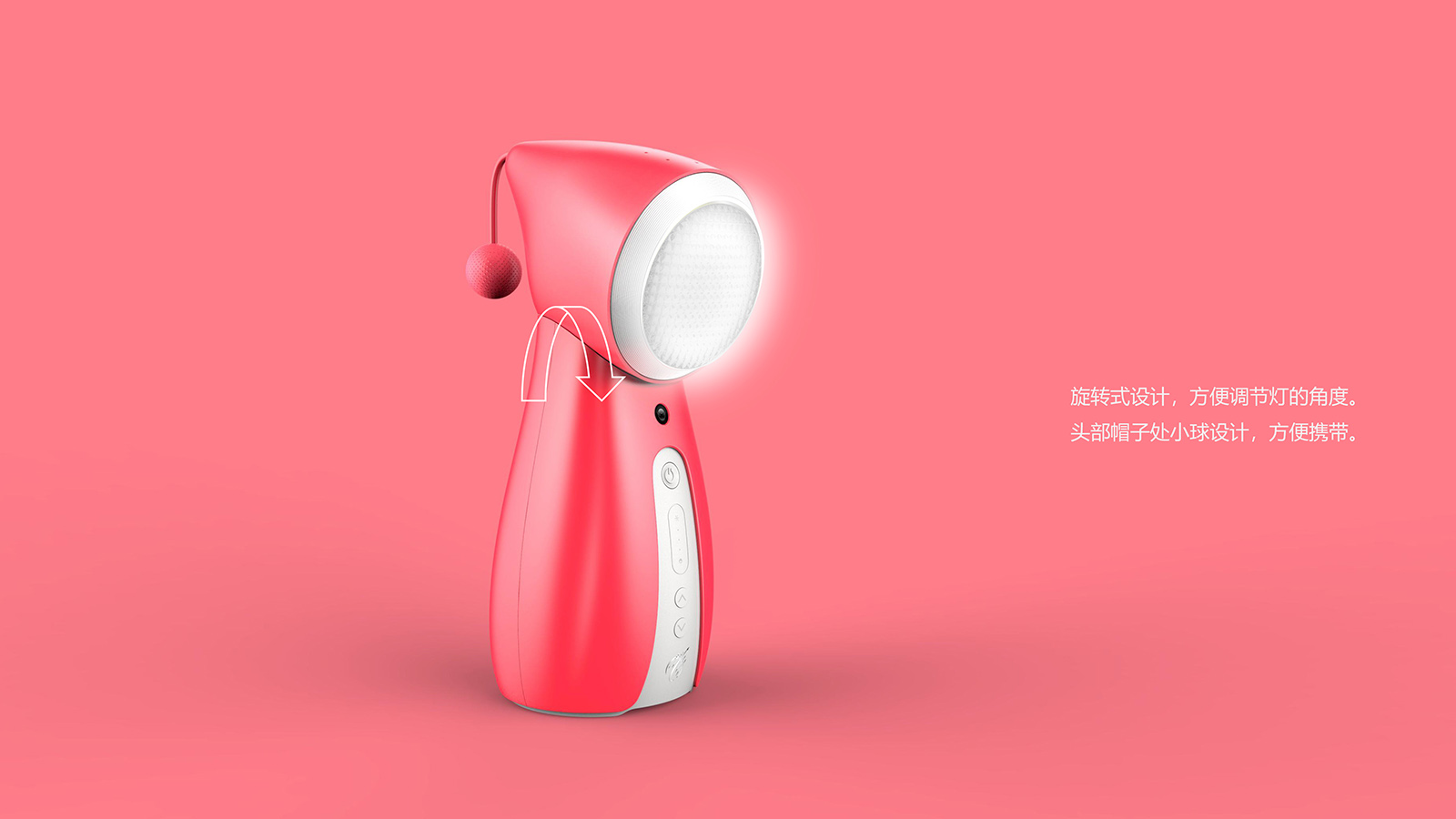 设计灵感来源于小红帽,时尚、简洁、圆润的设计风格,让人感觉更舒适,更容易接受。头部小球的设计,更容易手提,另外也增加了产品的趣味性,金属与塑胶的对比,提升了产品整体的档次,品质感更强。
